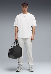 Bela majica s kratkimi rokavi s črnim logotipom, sive športne hlače z logotipom in črna torba za športno opremo. Sivi športni čevlji z zelenimi poudarki.