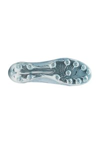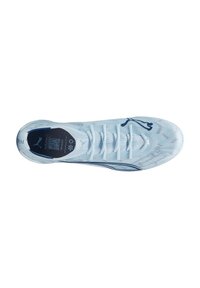 Svetlo modri Puma nogometni čevelj z zavezovanjem spredaj, teksturirano zgornjo stranjo, kovinsko srebrnim petnim delom in površino s kocami za oprijem na travi.
