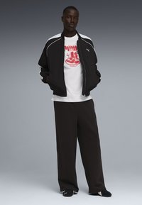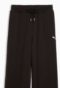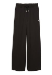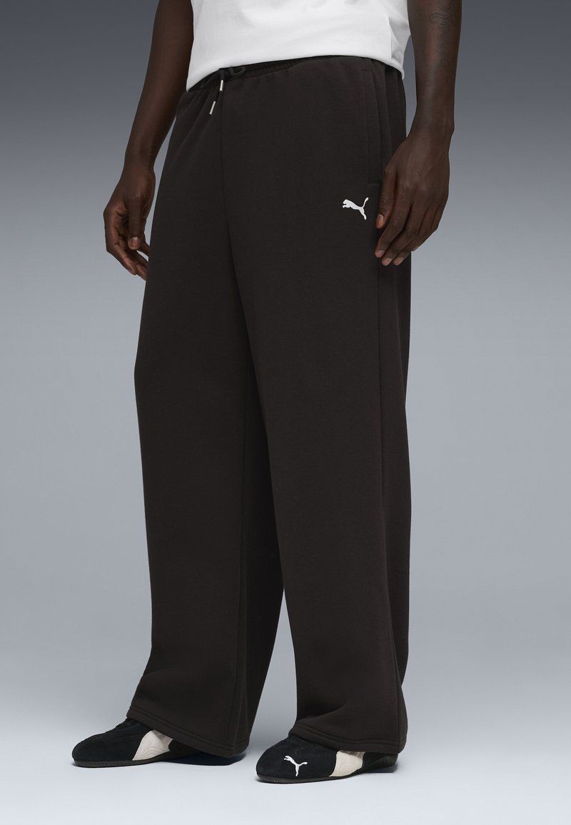 Črne široke trenirka hlače Puma z vrvico v pasu, ki jih nosi stoječa oseba z črno-belimi Puma supergami.