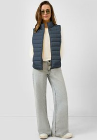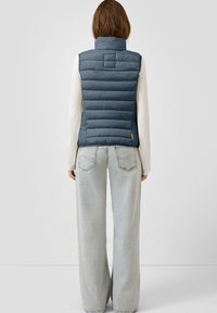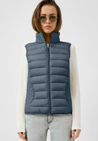 Modra puhasta brezrokavnik z visokim ovratnikom, navpičnimi prešivi in stranskimi žepi, nošen čez belo majico z dolgimi rokavi, postavljen na nevtralno ozadje.