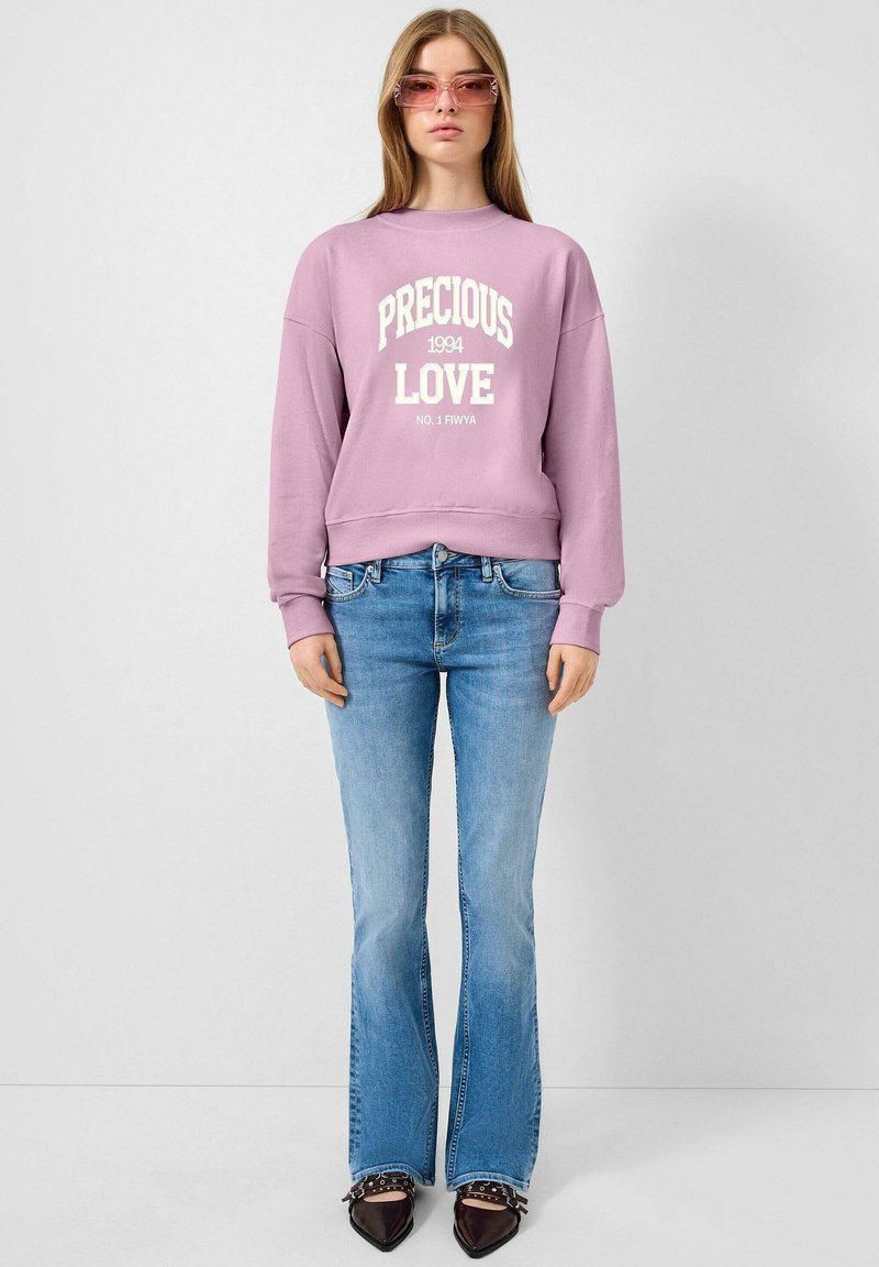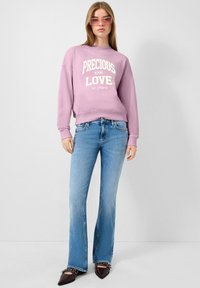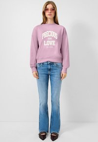 Ženska v roza puloverju s kapuco z napisom "PRECIOUS LOVE 1994", modri zvončasti jeans hlači, roza sončna očala in črne koničaste čevlje s sponkami.