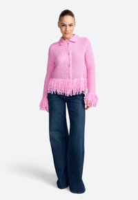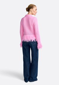 Nasmejana ženska, oblečena v ročno kvačkano roza jopico z gumbi in resicami, stoji z iztegnjenimi rokami na belem ozadju.