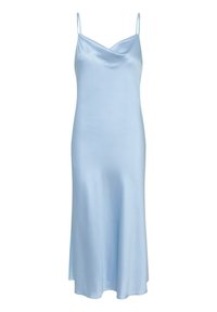 Roza satenasta midi obleka s tankimi naramnicami, V-izrezom in razširjenim robom. Manekenka nosi svetle, okrašene čevlje s konicami.