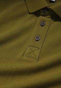 Olivno zelena polo majica z dolgimi rokavi in ovratnikom, združena s temno modrimi hlačami in belimi supergami, drži mornarsko modro jakno.