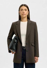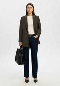 Ženska s ravnimi rjavimi lasmi, ki nosi srebrne obročaste uhane, rjavo suknjo, belo majico, temne kavbojke in drži črno usnjeno torbico.