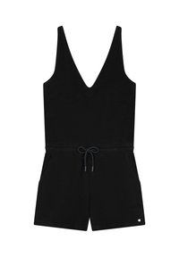 Modra frotirna obleka s V-izrezom, brez rokavov, elastičnim pasom, vrvico in stranskimi žepi. Gladka tekstura in sproščen kroj.