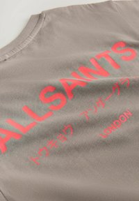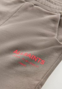 Bež kratka majica z raztegljivim elastičnim pasom in kratke hlače, obe z majhnim rdečim logotipom "ALLSAINTS" na levi prsni strani in stegnu.