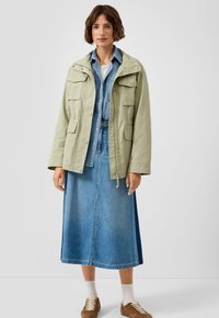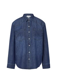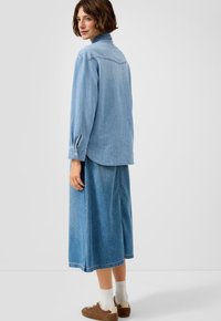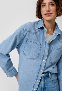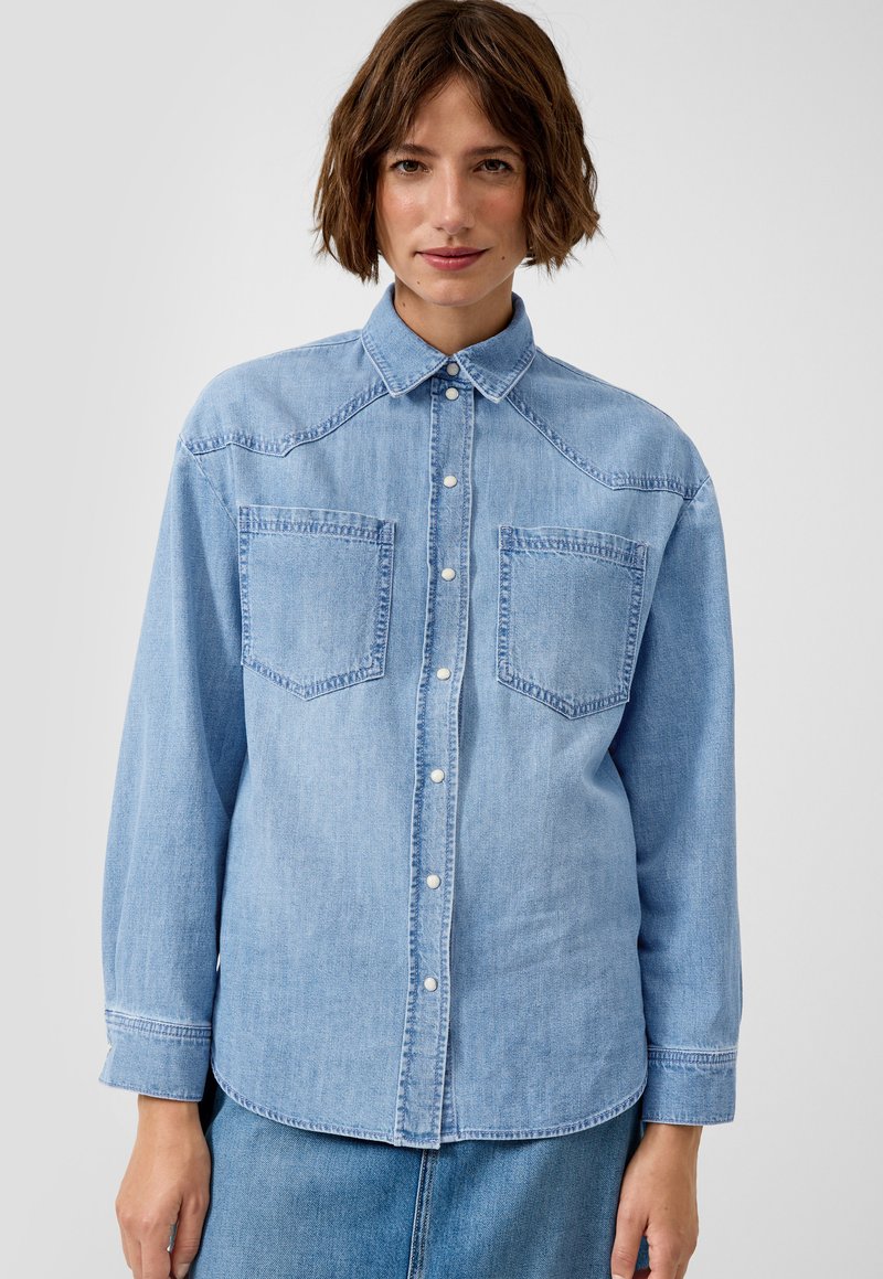 Ženska nosi svetlo modro denim srajco z gumbi in dvema žepoma na prsih, stoji ob preprostem svetlem ozadju.