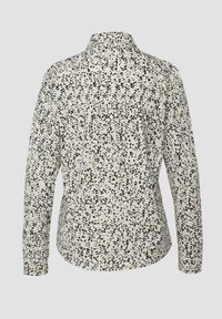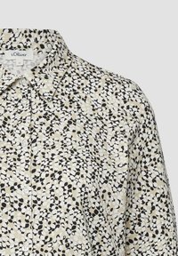 Srajca na gumbe s svetlo kremno osnovo in razpršenim vzorcem črnih in temno modrih pik. Ima klasičen ovratnik in dolge rokave.