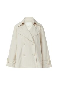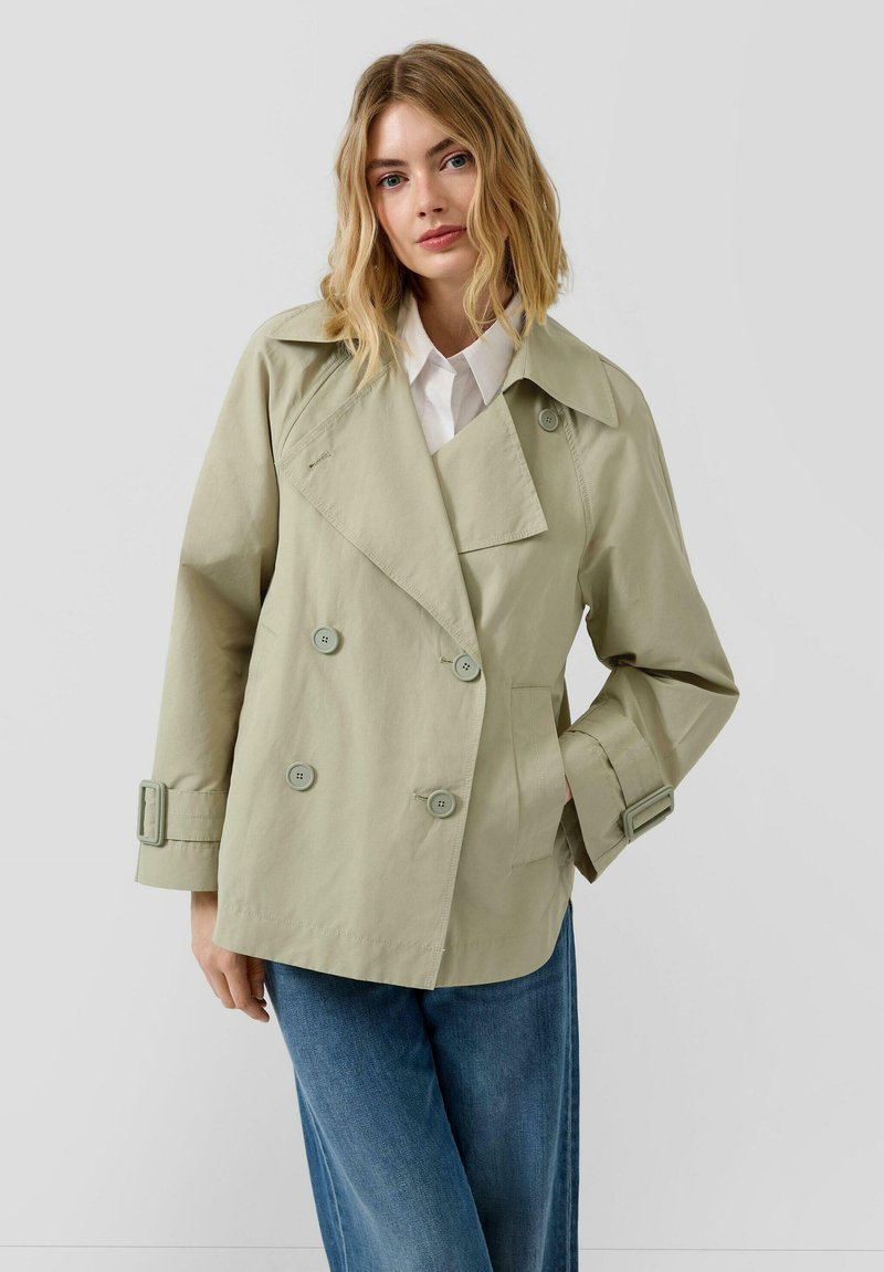 Ženska s svetlo rjavimi ramenskimi lasmi, oblečena v bež dvovrstni trench coat in modre kavbojke pred enakomerno ozadje.