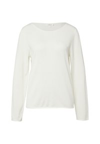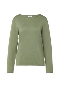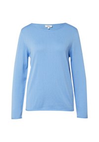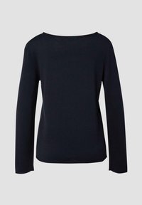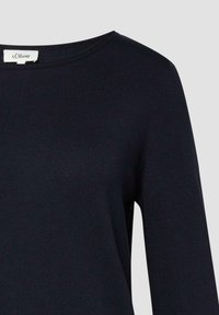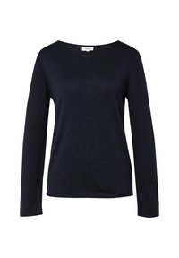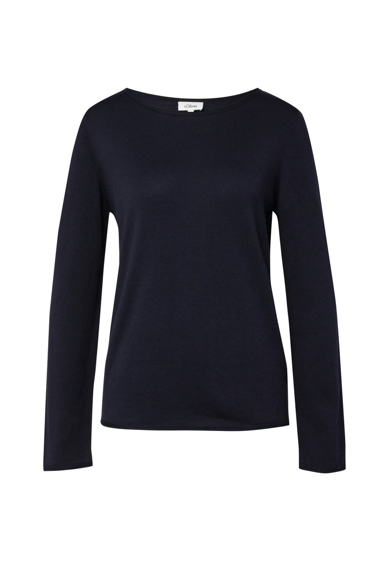 Temno modra majica z dolgimi rokavi in širokim okroglim izrezom, izdelana iz mehkega, teksturiranega blaga. Ponaša se z ravnim krojem in minimalističnimi šivi.
