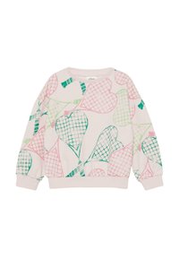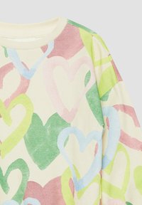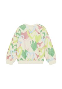 Pulover z okrolim vratom z vzorci src pastelnih barv v zeleni, roza in modri na kremni podlagi, z dolgimi rokavi in rebrastimi manšetami.