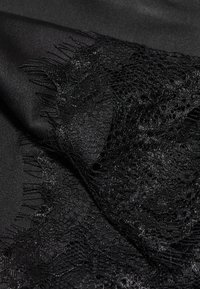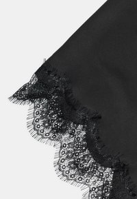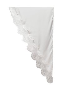 Črna usnjena jakna čez belo srajco z gumbi, zložena s črnim šaljem z čipkastim robom, kombinirana z poškodovanimi sivimi kavbojkami.
