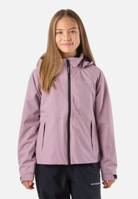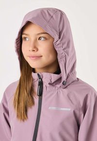 Svetlo vijolična nepremočljiva jakna z zadrgo spredaj, kombinirana s črnimi hlačami in črnimi čevlji. Ima kapuco in stranske žepe.