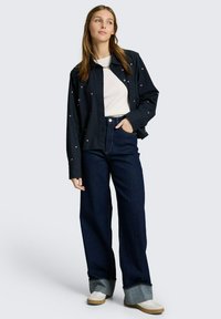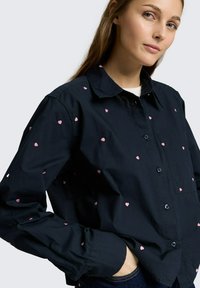 Mlada ženska, oblečena v črno srajco z gumbi, ki ima majhne roza vzorce v obliki srca, in temno modre kavbojke, stoji pred enostavno ozadjem.