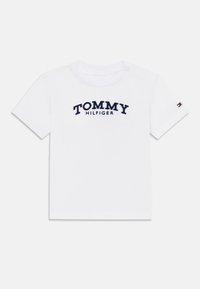 Bež bombažna majica s kratkimi rokavi, na prsih je bela značka z napisom "TOMMY HILFIGER", na rami je pritrdilni gumb.