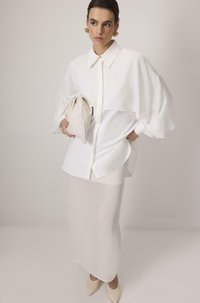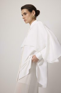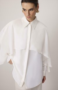 Ženska, ki nosi belo bluzo s širokim večplastnim yokom v obliki ogrinjala, ošiljenim ovratnikom in dolgimi rokavi z manšetami na gumbe.