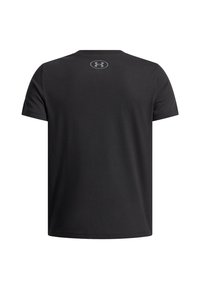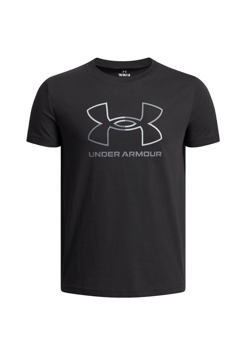Črna bombažna majica s kratkimi rokavi, na sprednji strani velika srebrna logotip Under Armour, okrogli izrez in raven spodnji rob.