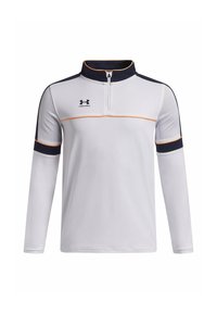 Črna majica z dolgimi rokavi z zadrgo na vratu, belimi detajli čez prsi in rokave ter logotipom Under Armour v beli barvi. Gladek material.
