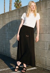 Bela majica s prugicami, črne široke hlače in bele superge. Majhna črna torbica nosi čez ramo. Svetla notranja postavitev.