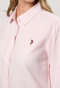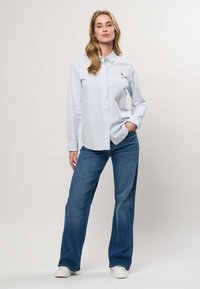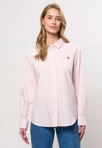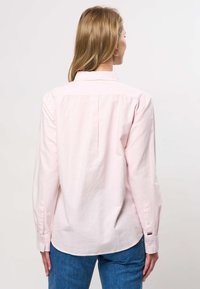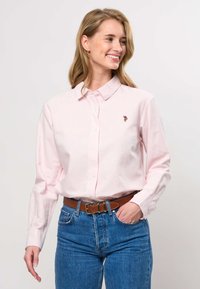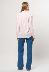 Nasmejana ženska v svetlo rožnati srajci z gumbi in majhnim vezenim logotipom, modrih širokih kavbojkah in bež čevljih, stoji na enobarvnem ozadju.