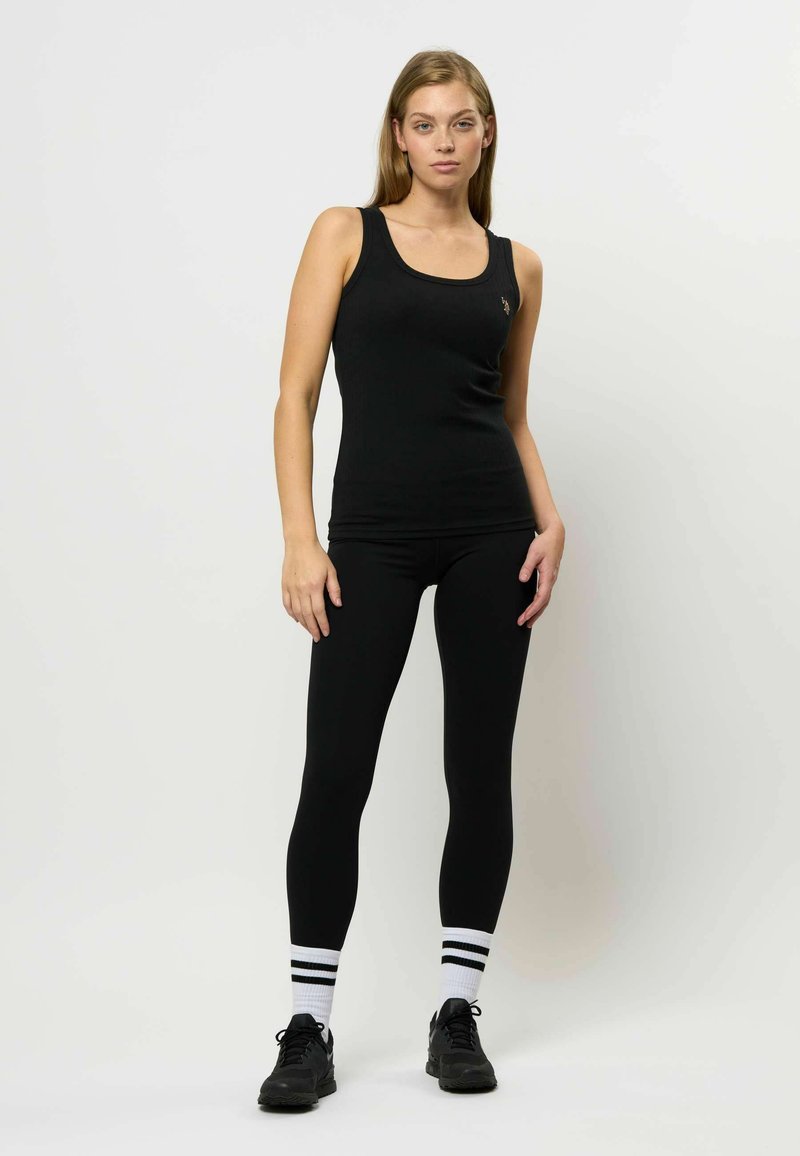 Črn majica brez rokavov iz rebraste tkanine, v kombinaciji s črnimi leginsami, črnimi supergami in belimi nogavicami z dvema črnima črtama.