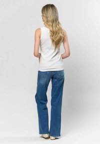 Bela rebrasta majica na bazi s izrezom, uparena sa svijetloplavim širokim trapericama. Istaknuti detalji uključuju mali izvezeni logo na majici.