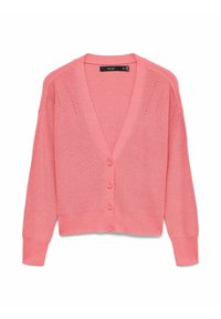 Koralen pleteni kardigan z dolgimi rokavi in V-izrezom, s tremi sprednjimi gumbi in rebrastimi detajli. Usklajen z visokim pasom oblečenimi kavbojkami.