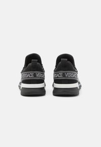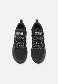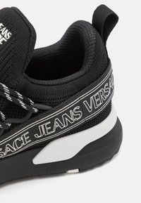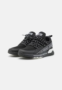 Črne superge iz mrežastih in sintetičnih materialov, z debelim vložkom, kontrastno belim logotipom in značilnimi črno-belimi vezalkami.