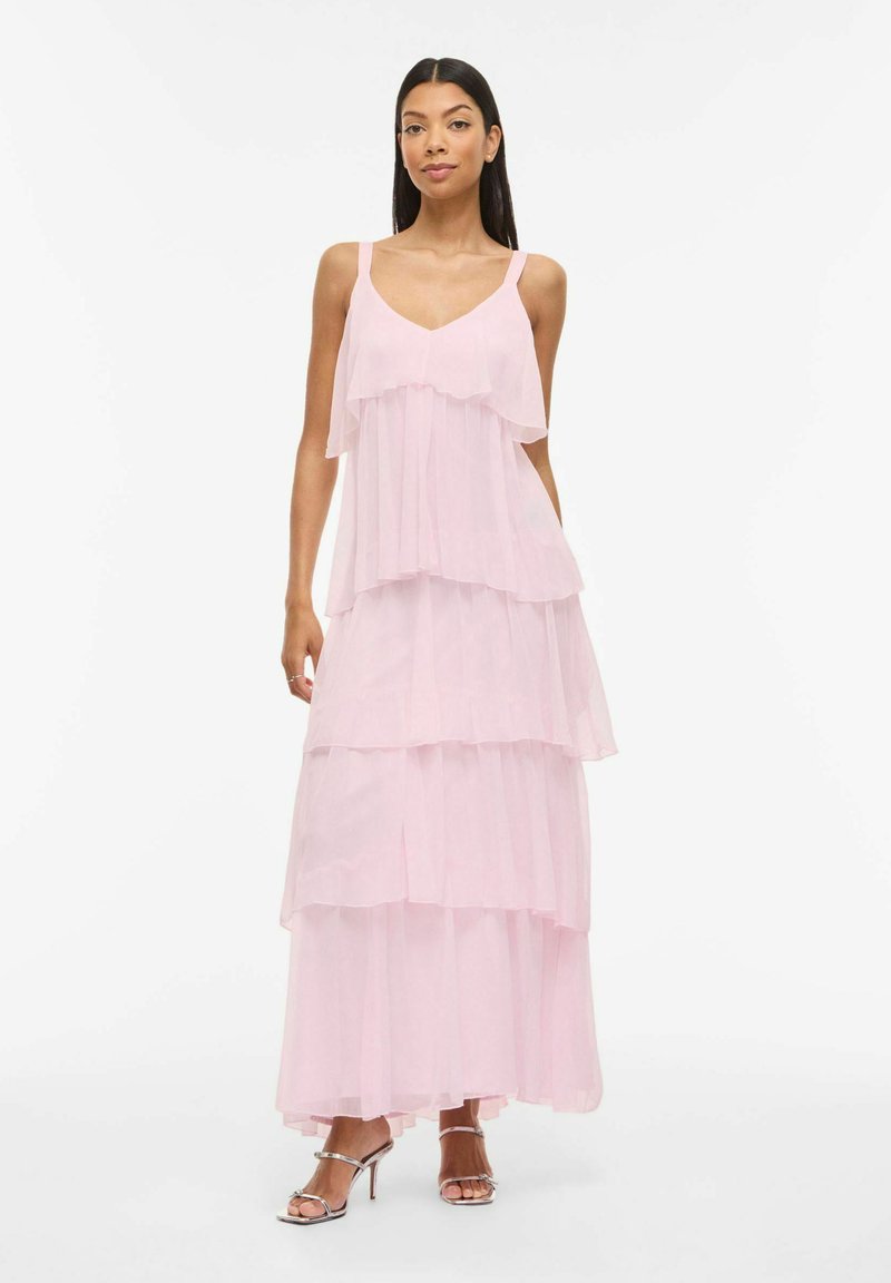 Ženska, oblečena v svetlo roza večplastno obleko do tal z tankimi naramnicami in srebrnimi sandali z visoko peto, ki stoji pred belim ozadjem.