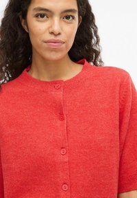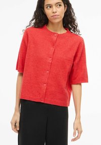 Ženska z kodrastimi lasmi, ki nosi rdeč kratek gumbast kardigan in črne hlače, stoji na belem ozadju.