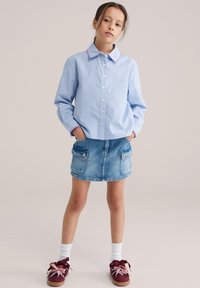 Dekle z rjavimi lasmi, oblečeno v modro srajco z drobnimi črtami in modro denim krilo, z rokami v žepih, gleda vstran.