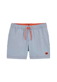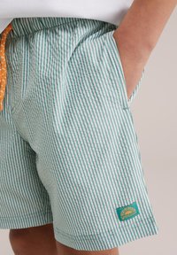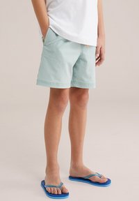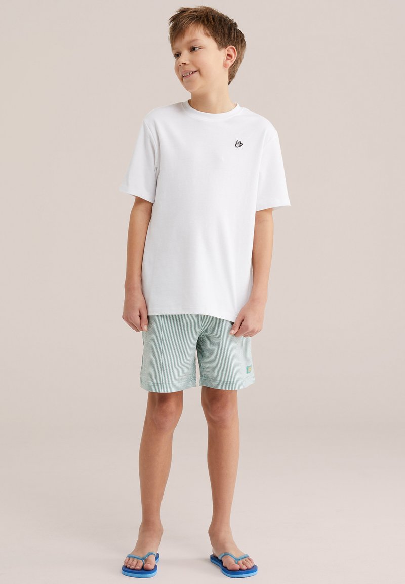 Fant, ki stoji, oblečen v belo majico z majhnim logotipom, svetlo modre kratke hlače s črtami in modne japonke, gleda vstran z rokami sproščenimi.