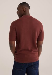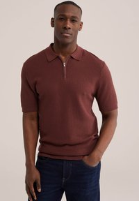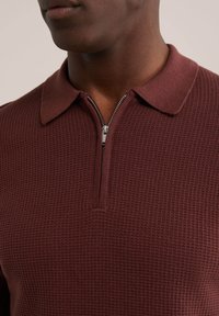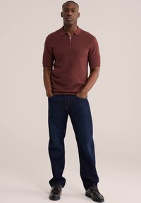 Moški, ki nosi kratkoročno, teksturirano bordo polo majico z zadrgo na ovratniku in temno modre kavbojke, stoji z roko v žepu.