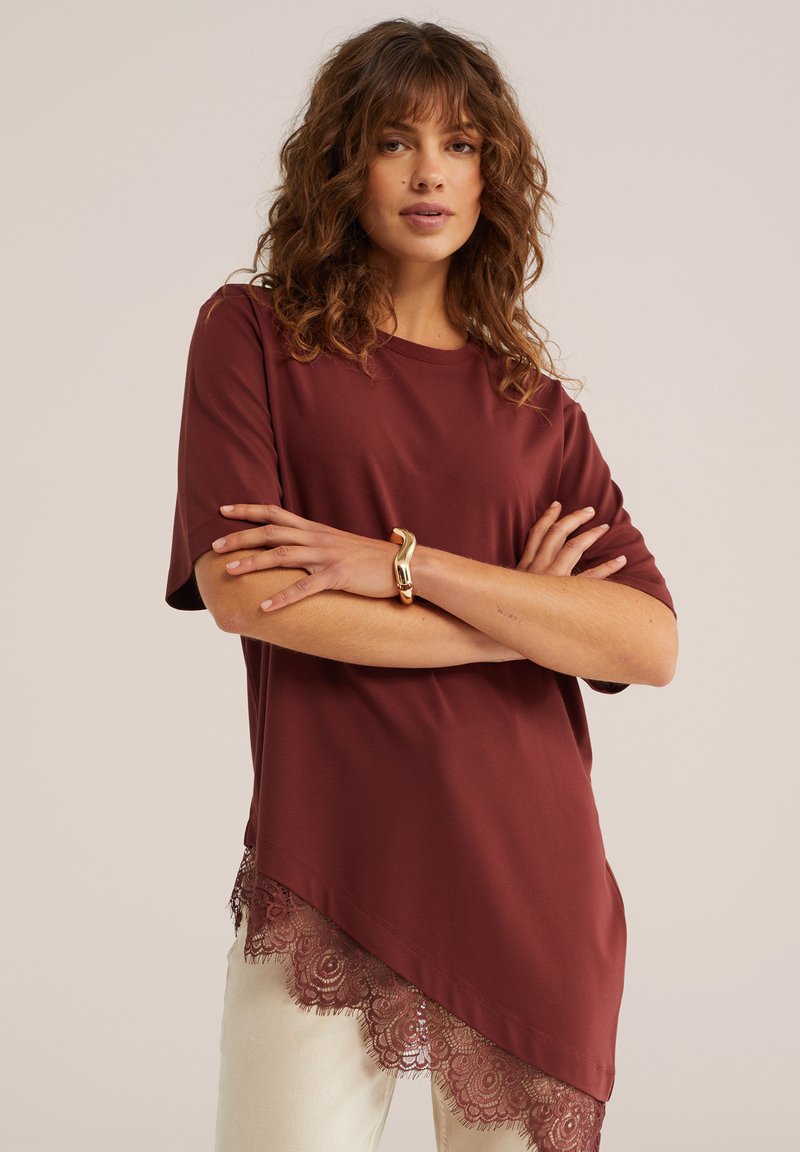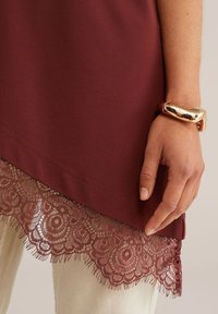 Ženska s kodrastimi lasmi, oblečena v vinasto asimetrično majico z čipkasto obrobo in z zlatim zapestnim trakom, stoji z zbranimi rokami.