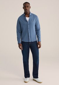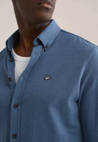 Moški, oblečen v modro srajco z gumbi prek bele majice in temne kavbojk, z eno roko v žepu, gleda vstran.