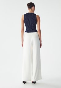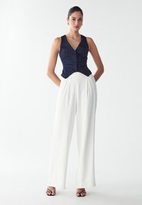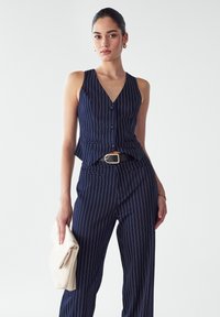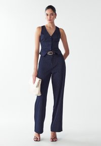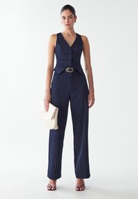 Temno modra obleka s črtami, ki vključuje brezrokavni top s peplum obliko in usklajene hlače, v kombinaciji s krema torbico.