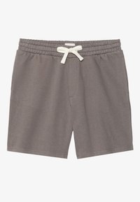 Dve pare kratkih hlač: ene sivo in ene črne. Obe imata elastičen pas z belim vrvico in enostavno, gladko teksturo.