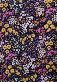 Kratka obleka z rožnatim vzorcem iz temnega blaga. Ima V-izrez, večbarvne cvetlične vzorce v rumeni, roza in beli barvi na temno modrem ozadju.