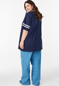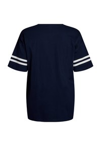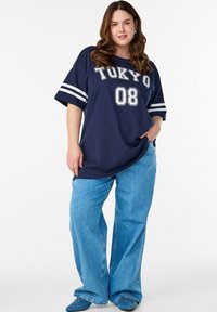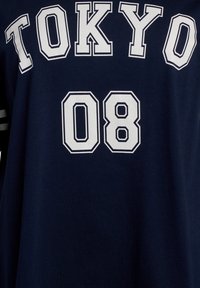 Prevelika mornarsko modra majica s kratkimi rokavi, na kateri je v belem tiskano "TOKYO 08". Kratki rokavi so okrašeni z belimi črtami. Narejena iz mehkega bombažnega materiala.