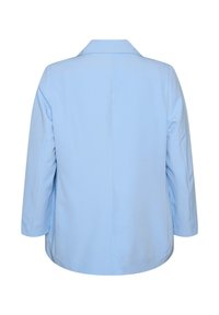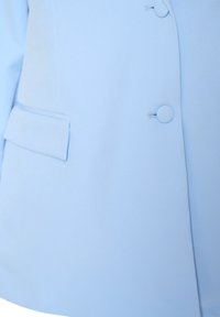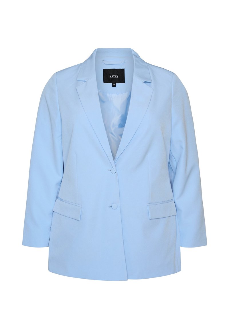 Svetlo modro žensko suknjič z notch ovratnikom, z dvema gumboma spredaj, žepi z zavihki in gladkim podlogom, velikost 44, znamke Zizzi.